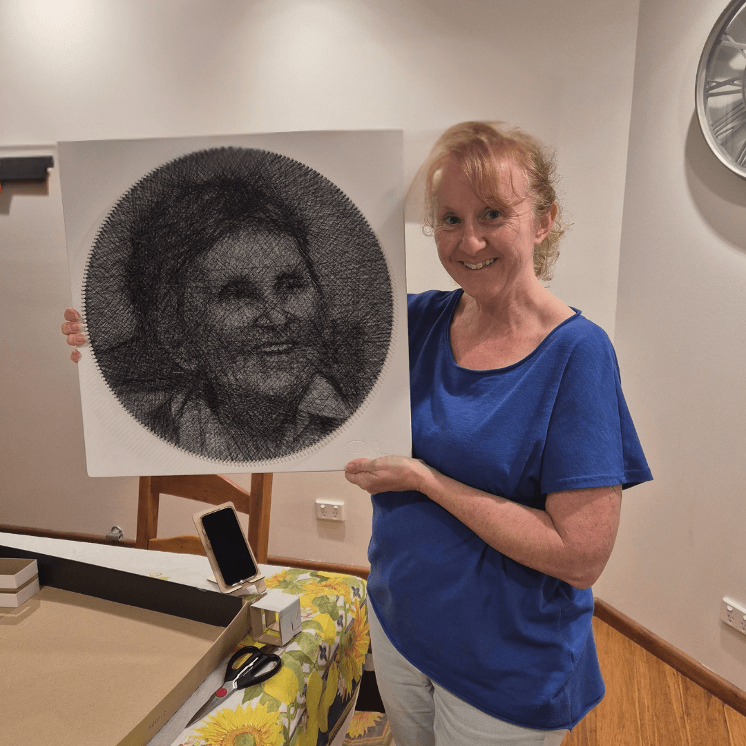 I decided to make a portrait of my Nan. She’s always been very special to me, and as I wrapped the string around each nail, I felt so much love and warmth thinking about her. It was calm, meaningful, and really special to see it all come together.